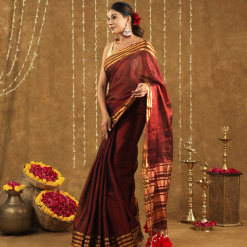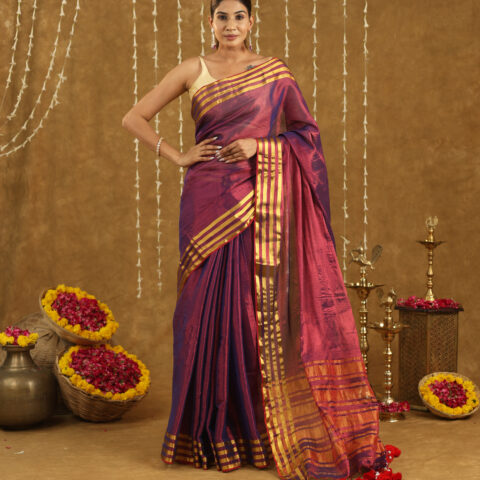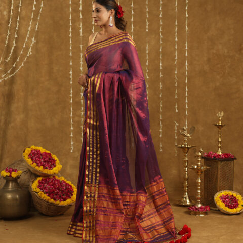Experience The Epitome Of Luxury With Our Pure Handloom Katan Silk Saree, Meticulously Crafted By Skilled Varanasi Weavers. This Exquisite Masterpiece Showcases A Harmonious Blend Of Magenta And Maroon, Creating A Captivating Dual-Tone Effect That Enchants The Senses. Adorned With An Intricate Floral Jaal Pattern Meticulously Woven Across Its Entirety, Each Thread Reflects The Rich Heritage And Timeless Beauty Of Indian Craftsmanship. Elevate Your Ensemble With This Timeless Creation, Perfect For Adding A Touch Of Elegance To Any Occasion.