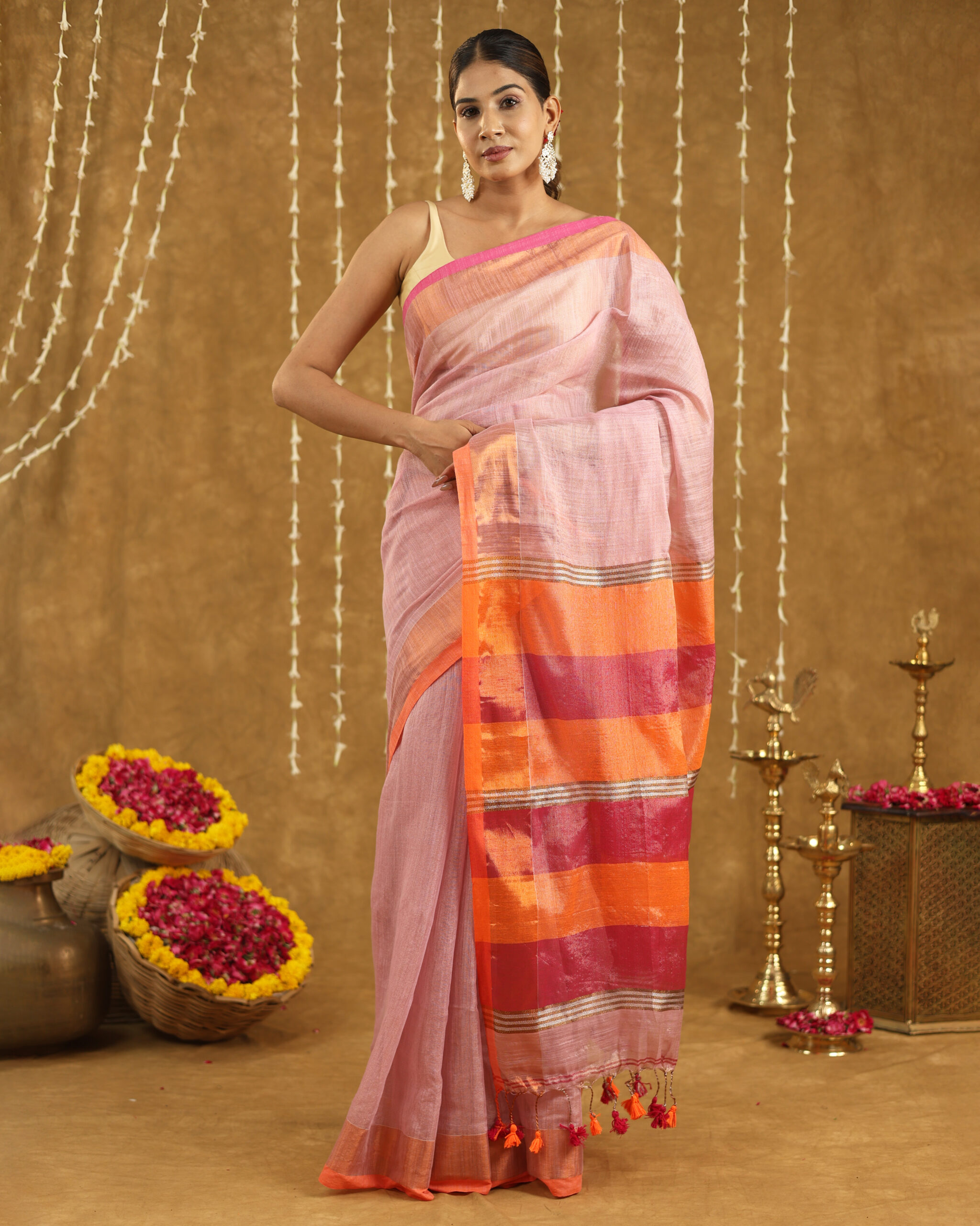 REKHARAAGA Pastel Pink with Contrast Orange-Pink Border & Pallu