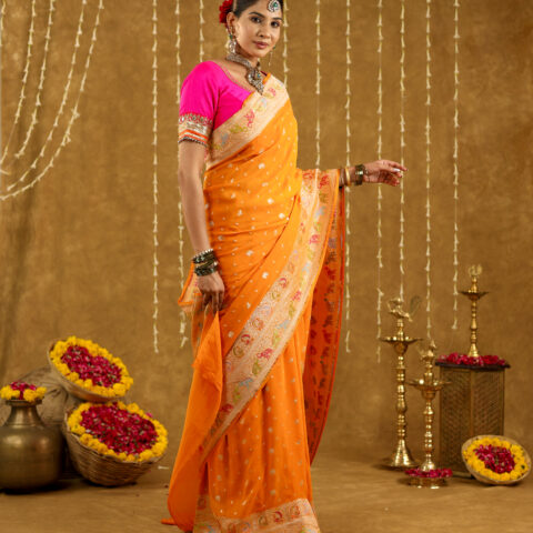 Classic Handwoven Banarasi Jangla Art Passed Down Through Generations Of Weavers Made With Cutwork (Phekva) Weaving